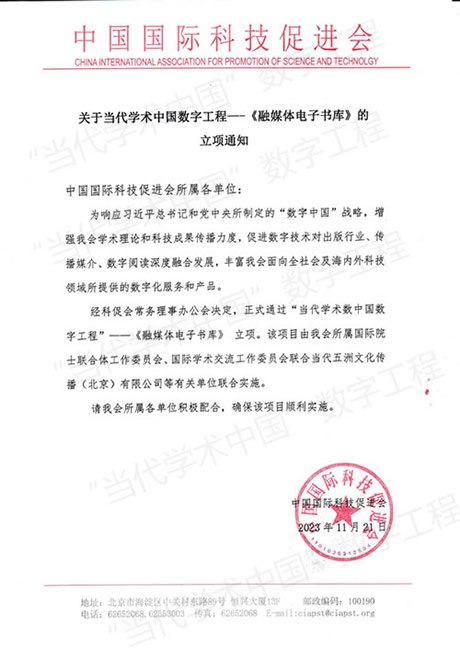 2023年11月,经中国国际科技促进会常务理事办公会决定,正式通过“当代学术中国数字工程”——《融媒体电子书库》立项。此项数字工程会对增强学术理论和科技成果传播力量,促进数字技术对出版行业传播媒介数字阅读深度融合发展,丰富向社会及海内外科技领域所提供的数字化服务和产品做出重大贡献。